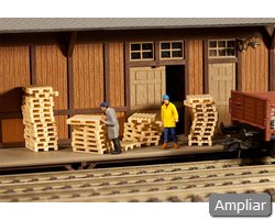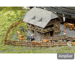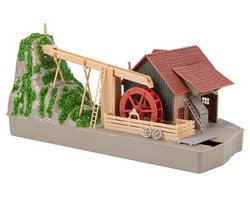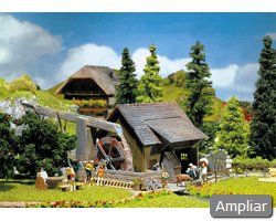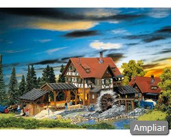 Descrição: Serração da Floresta Negra. A roda de água é acionada por um motor incluído (12–16 V, corrente alterna). Inclui assortimento de tábuas e madeira. O parque de toros pode ser ampliado com artigos adicionais (conforme sistema FALLER).