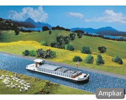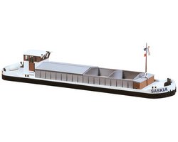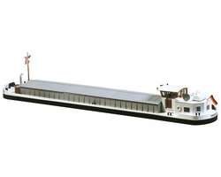Descrição: Barcaça de carga para navegação fluvial em maquetas. Escotilhas de carga cobertas e casa do leme. Modelo não flutuante, com fundo plano.