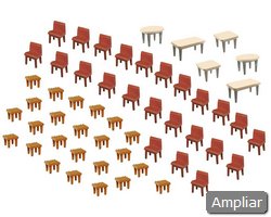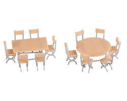 Descrição: Conjunto de mobiliário com duas mesas e doze cadeiras, adequado para interiores e pequenas cenas de restauração.