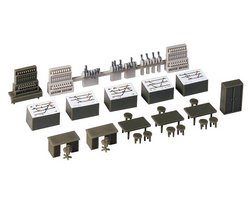 Descrição: Conjunto de equipamento para decoração interior de torres de sinalização, incluindo elementos típicos como alavancas de comando, mobiliário e acessórios técnicos. Ideal para acrescentar realismo a edifícios ferroviários detalhados.