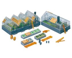 Descrição: Centro de jardinagem com 2 estufas em vidro, 3 canteiros de cultivo, esteiras de palha e acessórios.