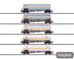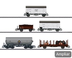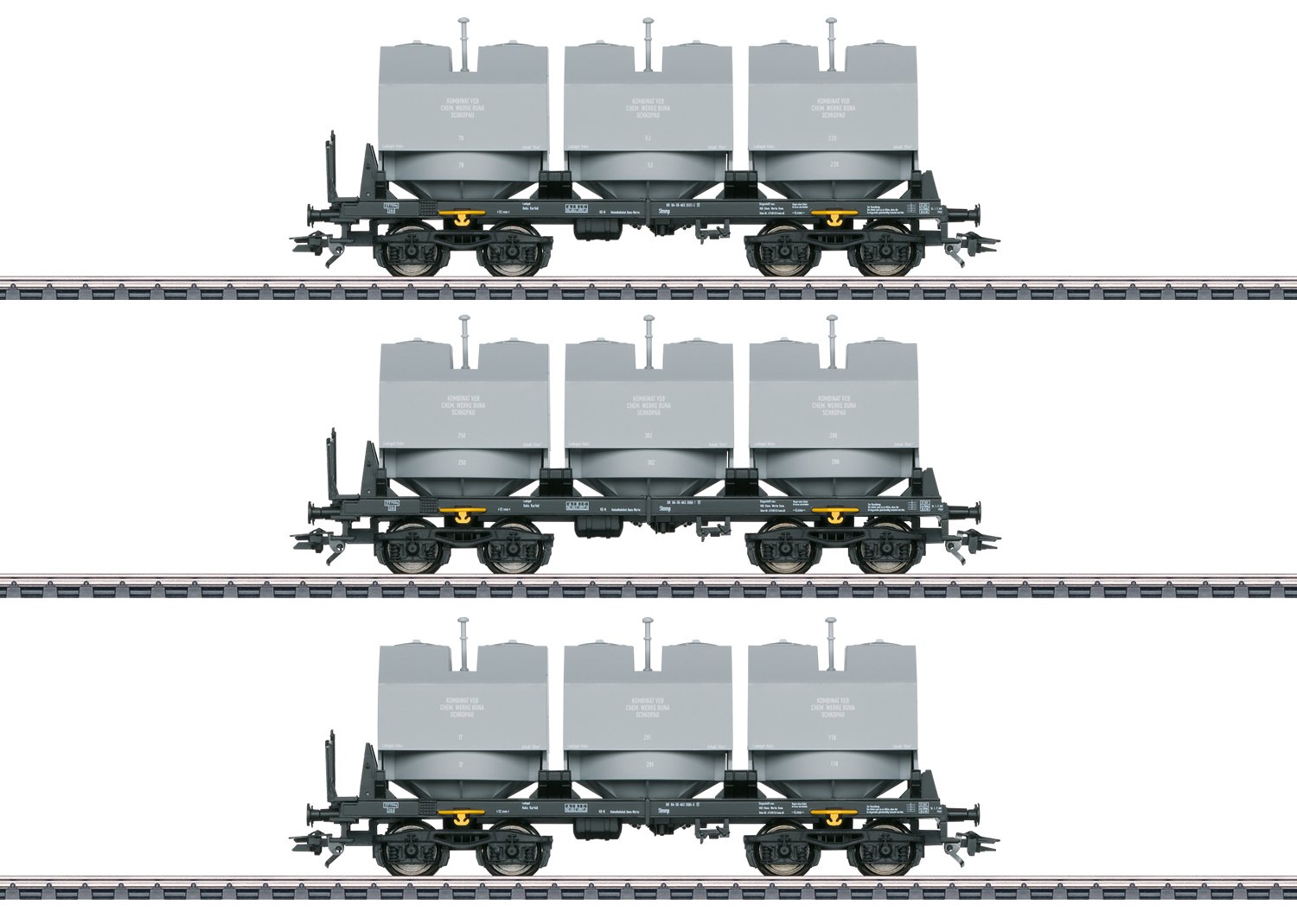 Quatro possuem freios manuais e plataformas de freio com cabine de freio, as estruturas dos vagões são detalhadas e parcialmente abertas. As manivelas do freio manual, o sistema de freios e os tubos de descarga são modelados com detalhes e aplicados separadamente. As plataformas de trabalho são aplicadas separadamente com escadas. As plataformas do freio são aplicadas separadamente, com e sem cabine de freio separadamente aplicadas. Os vagões possuem engates próximos com mecanismos de guia. Cada vagão é embalado individualmente em caixas marcadas. Comprimento sobre os buffers por vagão: aproximadamente 10,1 cm / 3-15/16. Conjunto de rodas DC E700580.