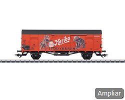 Protótipo: Vagão frigorífico antigo de dois eixos com cabina de guarda-freios. Vagão privado da empresa Haribo GmbH & Co. KG, Bonn, Alemanha. Utilizado pela Deutsche Bundesbahn (DB). Inclui um tema promocional. O vagão apresenta o aspeto que tinha por volta de 1959.