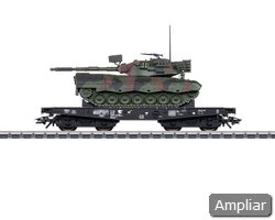 Modelo: O chassi do vagão-plataforma pesado é construído em metal. Inclui dispositivos de fixação da carga. O modelo do tanque Leopard 1A1 é maioritariamente construído em metal, com componentes adicionais aplicados separadamente, como as esteiras, feitas em plástico detalhado. A torre e o canhão são rotativos. A unidade está pintada com um padrão de camuflagem e apresenta marcações de identificação. O modelo do veículo militar é fornecido pela Schuco. Comprimento sobre os buffers: aproximadamente 12,4 cm / 4-7/8. Rodados para DC: E700580.