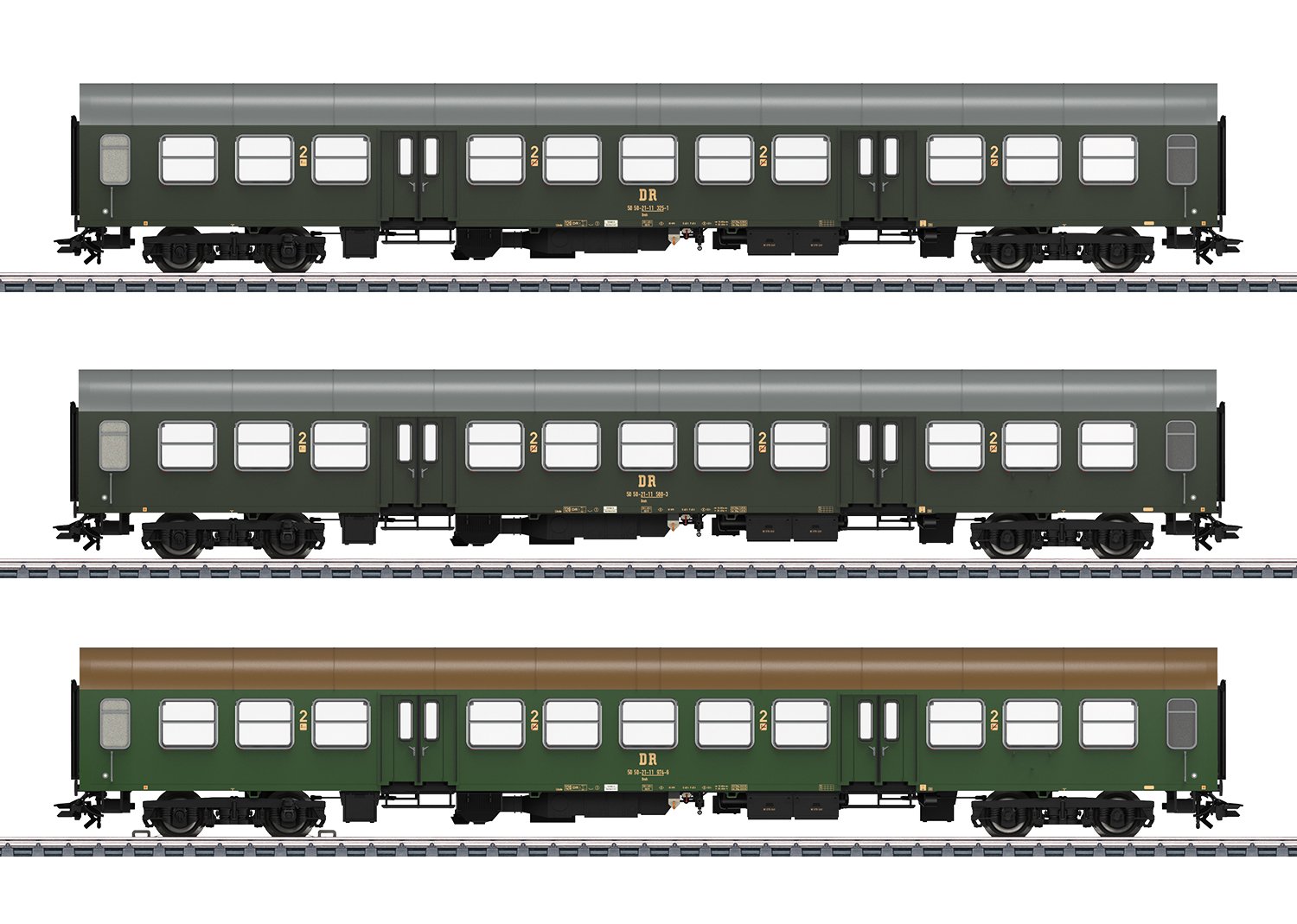 Protótipo: Três carruagens de passageiros tipo Bmh da Ferrovia Estatal Alemã (DR/GDR), 2ª classe. Design das Carruagens de Entrada Central de Halberstadt. Duas carruagens em verde escuro (TGL 2233) e uma carruagem em verde óxido de crómio (TGL 2235) como esquema básico de pintura. As carruagens apresentam-se como estavam no final dos anos 80.