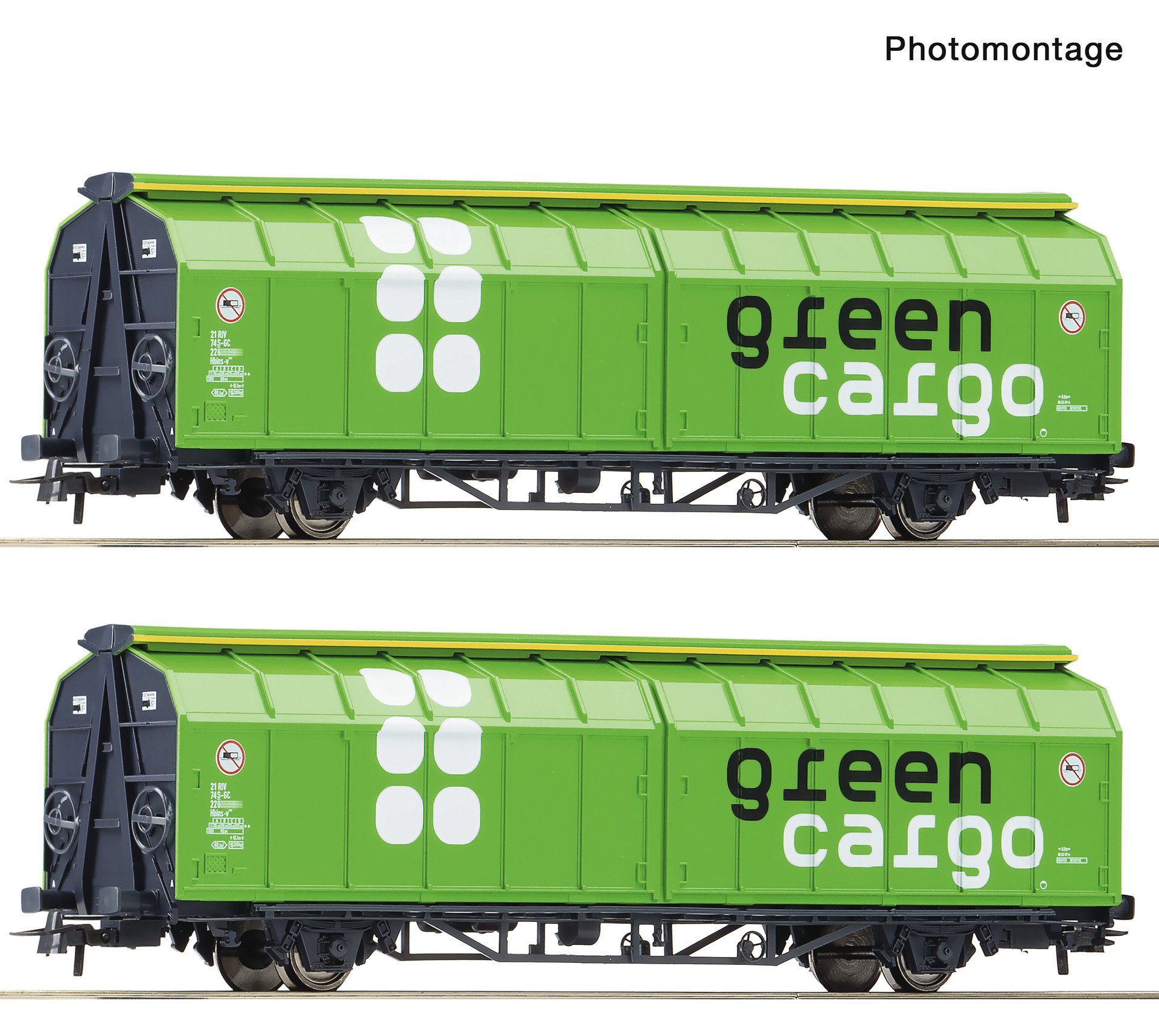 Conjunto de carros com dois carros de parede deslizante, tipo Hbillns-v, da Green Cargo.