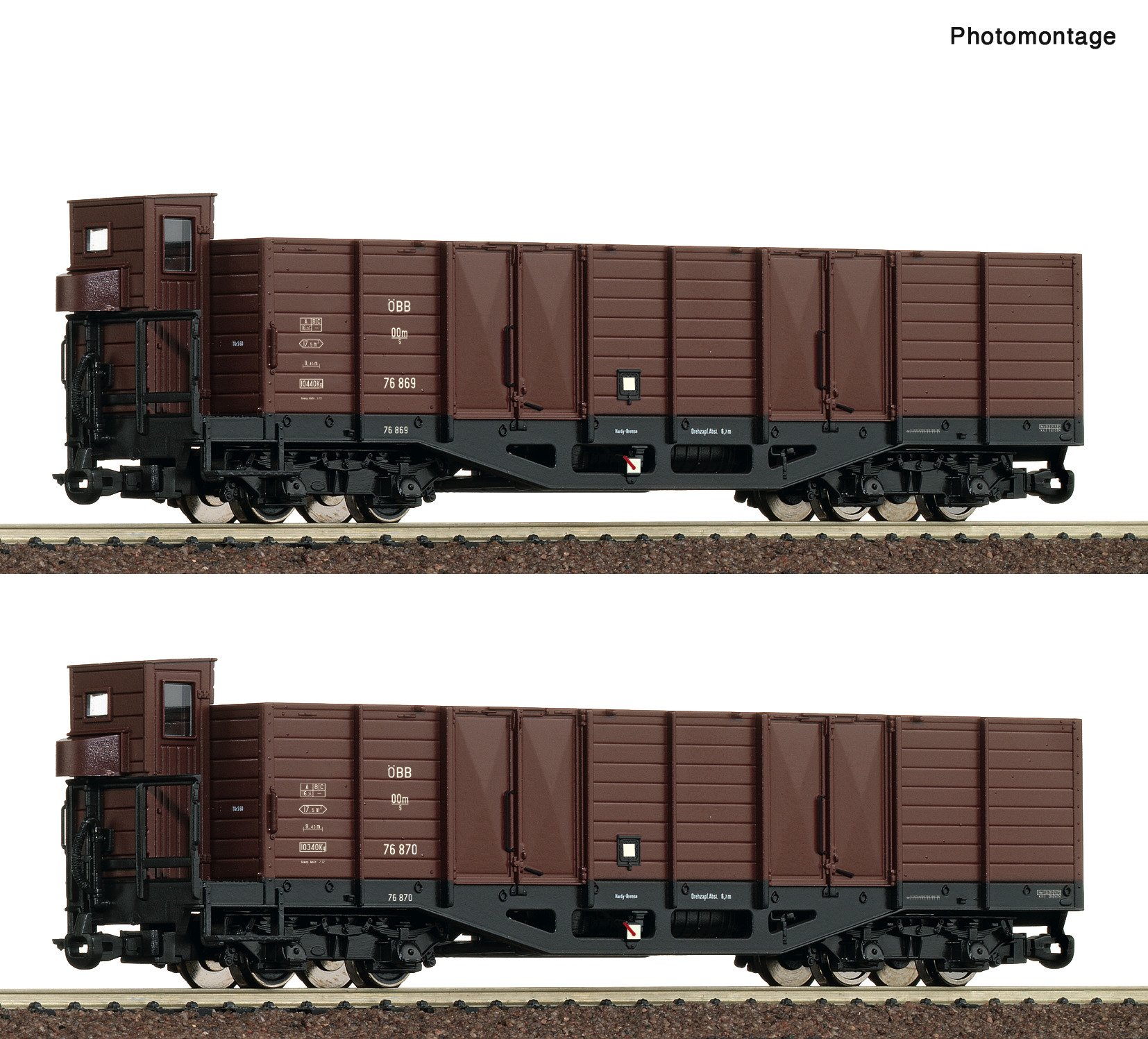 Conjunto de vagões com dois vagões de carga abertos de bitola estreita de 4 eixos, tipo OOm/s dos Caminhos de Ferro Austríacos.