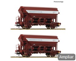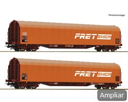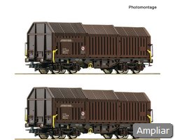 Conjunto de vagões com dois vagões de parede deslizante de 2 eixos, tipo Hbbis, dos Caminhos de Ferro da Alemanha Federal.