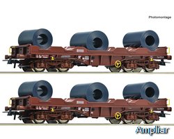 Conjunto de vagões com dois vagões de transporte de bobinas sem capota, tipo Shimmns, da Ferrovia Estatal Belga.