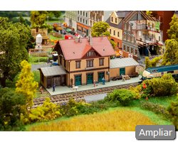 Descrição: Edição especial! Modelo Lasercut de um pequeno edifício de estação/apeadeiro, inspirado em originais de linhas secundárias no distrito de Schwäbisch Hall. Estrutura em enxaimel com alvenaria de tijolo em bonito tom vermelho e telhado de quatro águas.
