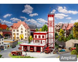 Descrição: Quartel de bombeiros com 2 portas funcionais de abrir, sirene no telhado, torre de secagem de mangueiras e andaimes/estrutura exterior.