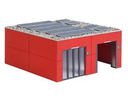 Descrição: Edifício de linhas simples. Nave versátil para viaturas ou armazenamento, com dois lugares e portas de fole envidraçadas quase à altura total da fachada. Pode ser montada com portas abertas ou fechadas.