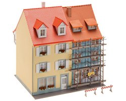 Descrição: Conjunto de duas casas; uma delas está rodeada por andaimes e encontra-se a ser pintada. Inclui as peças do andaime para criar a cena de obra/renovação.