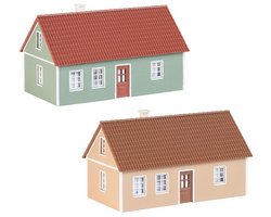 Descrição: Conjunto de duas casas térreas simples com fachada rebocada, janelas de frontão e telhado em telha. Fachada e telhado em cores diferentes, com portas/molduras de janelas e cantos de parede em branco para contraste.