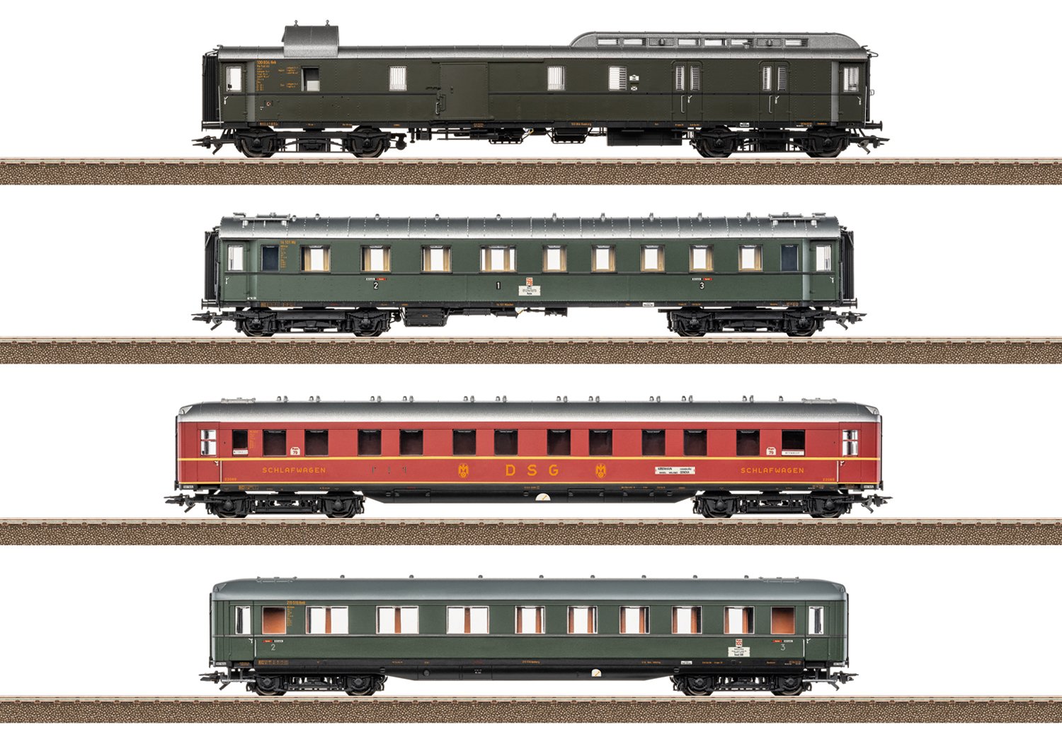 Protótipo: D 74 Hamburg-Altona – Basel SBB (secção Frankfurt–Basel), c.1955 (DB/DSG): 1x PwPost4ü (bagagens/correio), 1x ABC4ü (1.ª/2.ª/3.ª, 1928–30), 1x WLAB4ü(e) “Schürzen” (cama DSG), 1x BC4üwe “Schürzen” (2.ª/3.ª). Modelo: Construção detalhada e comprimento à escala. Raio mínimo 360 mm. Iluminação interior LED branco-quente de fábrica em todas as carruagens + condensadores tampão. Cabeças de engate curto (altura de tampões mais baixa). Inclui foles/corredores curtos de substituição para a extremidade do comboio. Placas de rota e números impressos. Inclui sanfona/folheto com ilustração e sequência prototípica da composição. Comprimento total entre tampões: aprox. 103 cm.