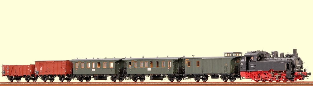 Protótipo: Três vagões de passageiros classe Bmh da Deutsche Reichsbahn (DR/GDR), 2ª classe. Design das Carruagens de Entrada Central de Halberstadt. Dois vagões em verde escuro (TGL 2233) e um vagão em verde óxido de crómio (TGL 2235) como esquema de pintura básico. Os vagões apresentam-se como eram no final dos anos 80.