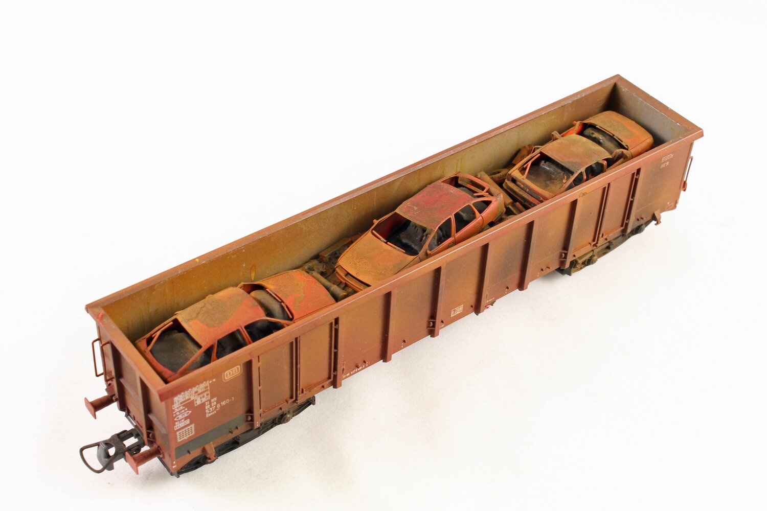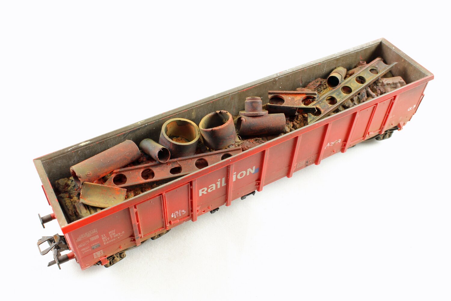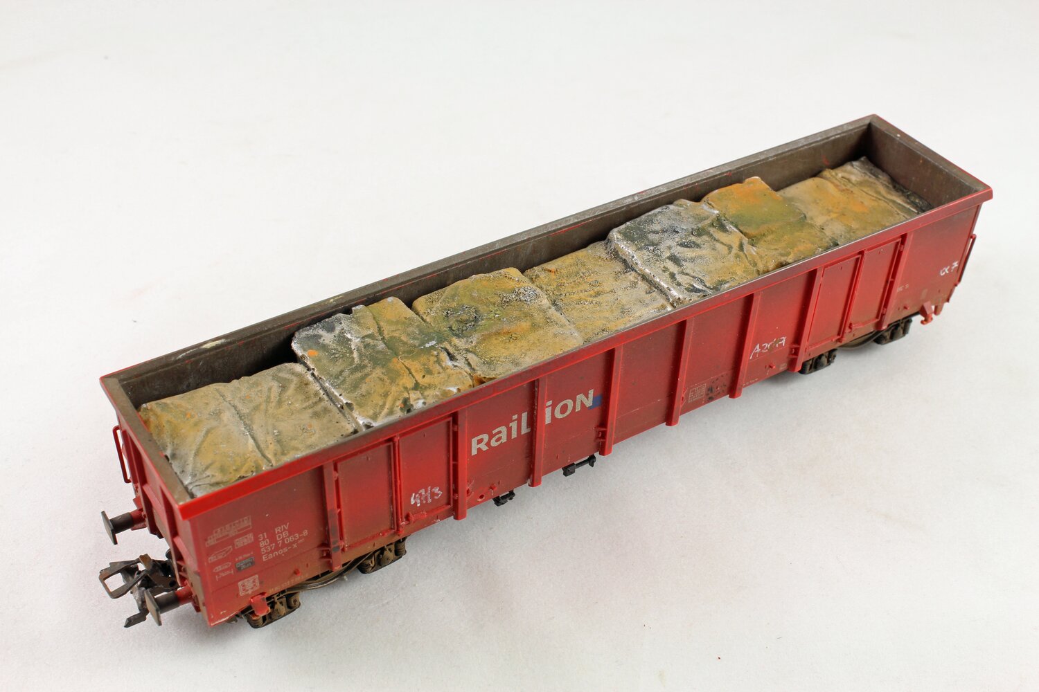 Modelo: O vagão está carregado com semi-reboques removíveis. O chassi do vagão é construído em metal fundido e possui mecanismo de engate próximo. Comprimento sobre os buffers: 102 mm / 4.